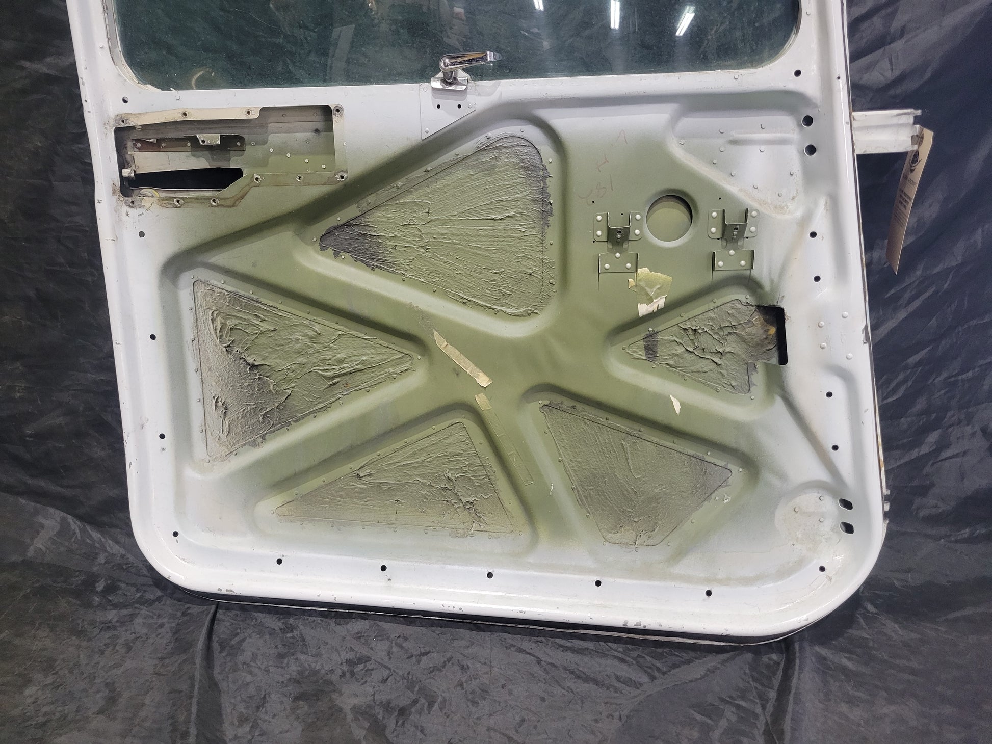 - Dent aft of the upper hinge