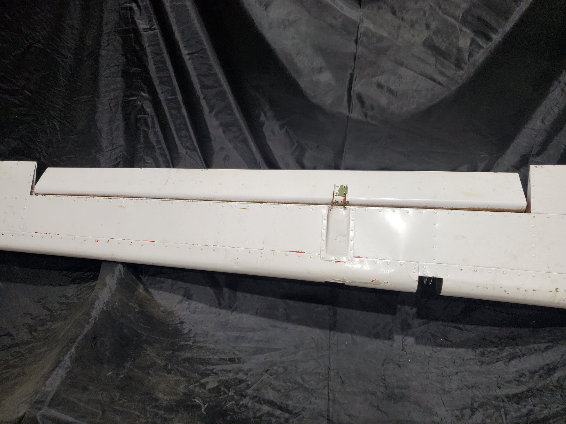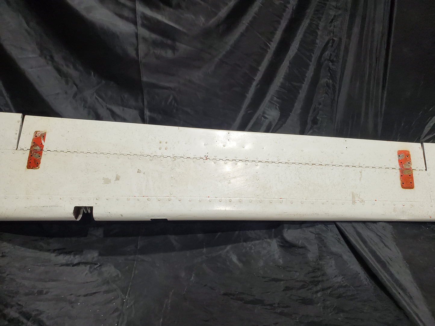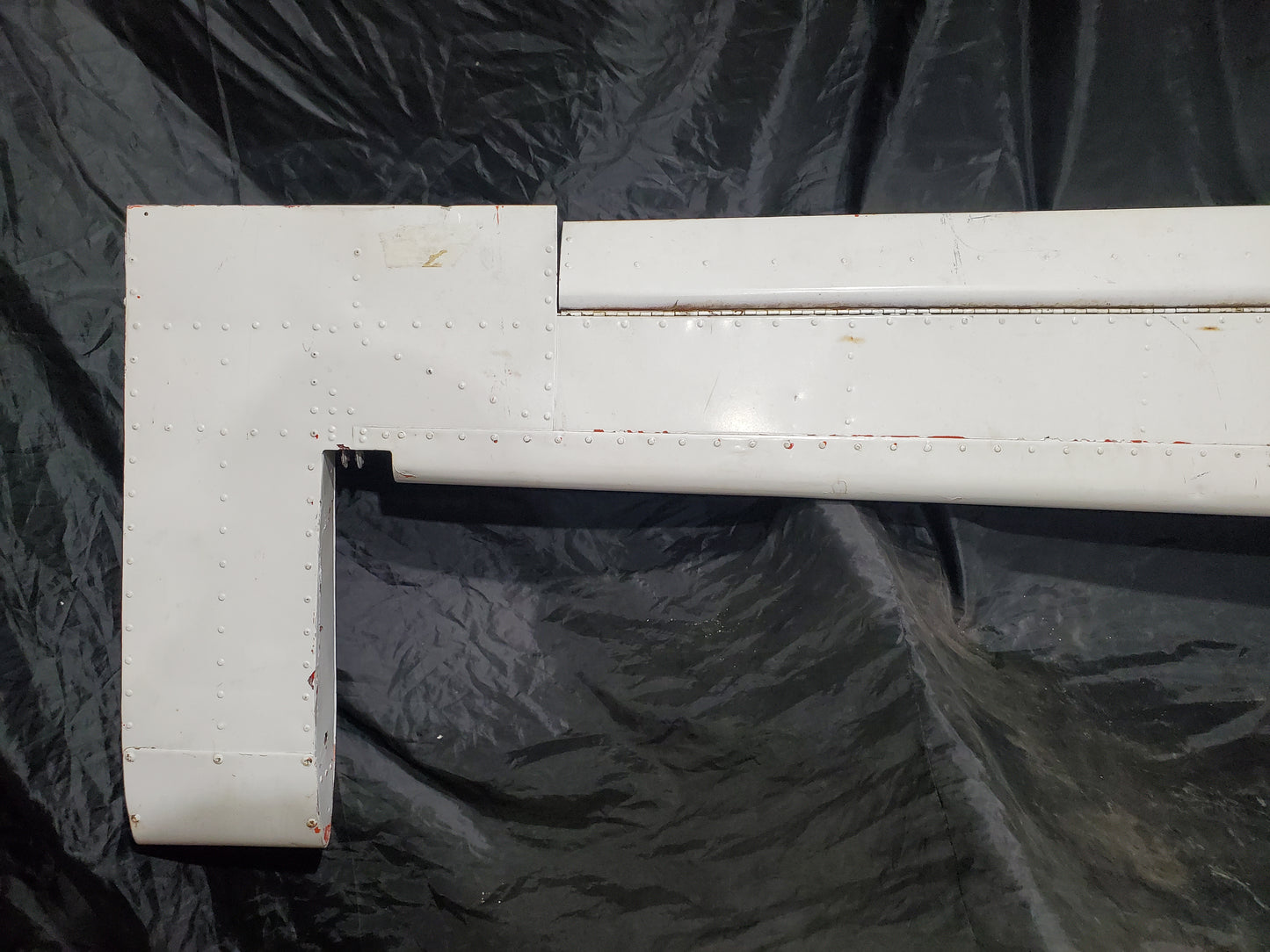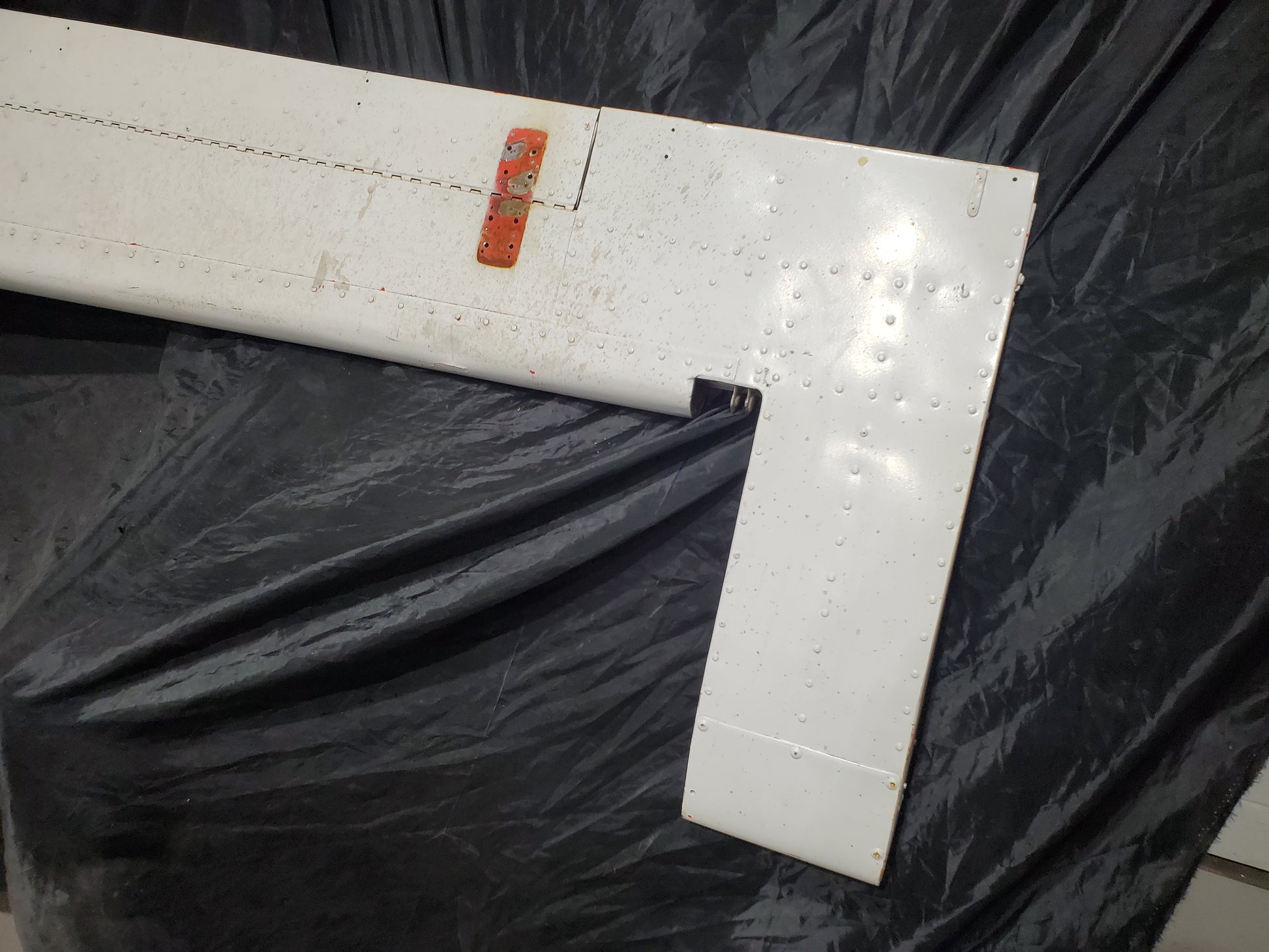 - Bulge in skin at spar. See photos. Holes drilled in skin and Trim tab. Missing hinge bearing.