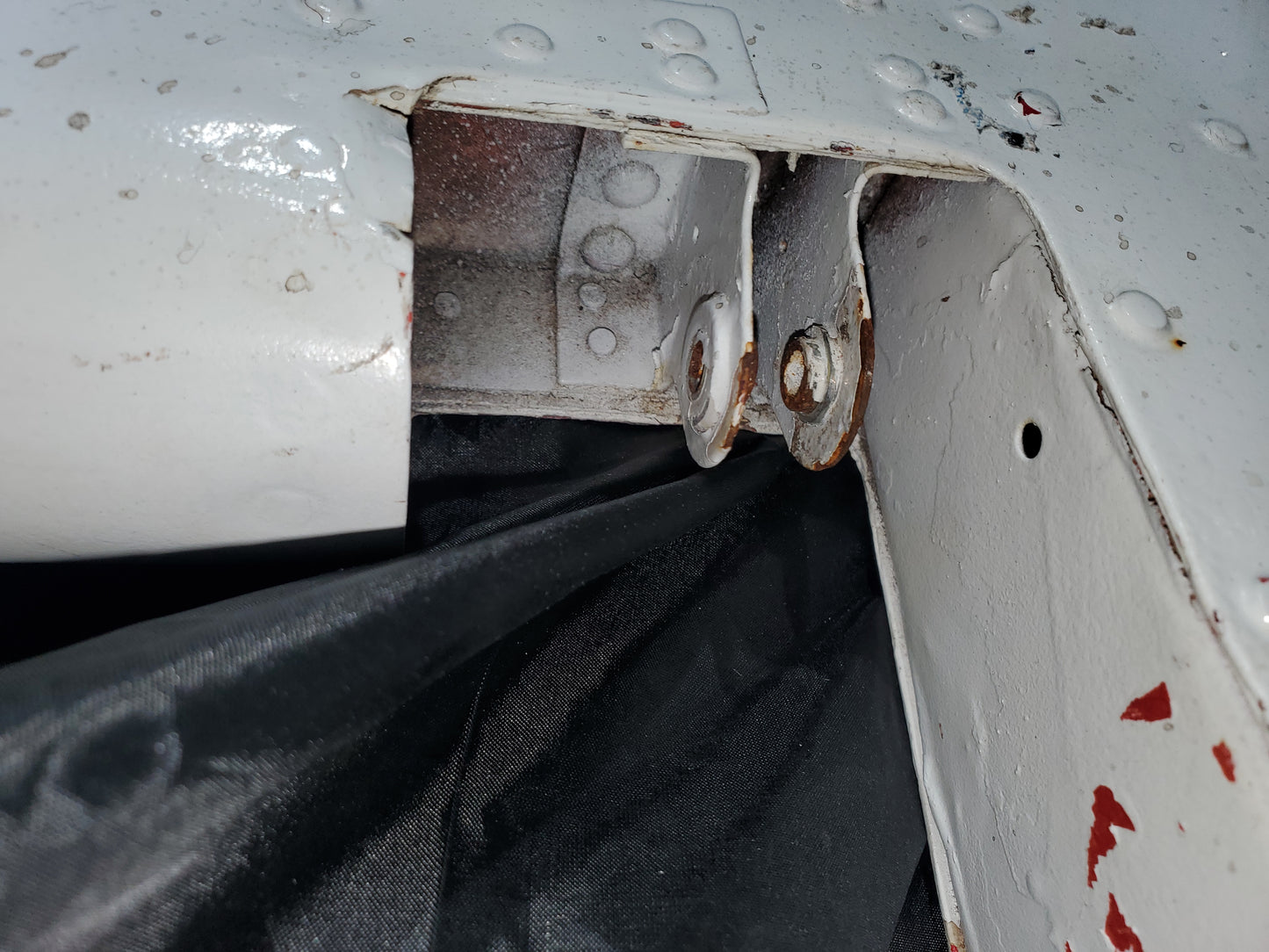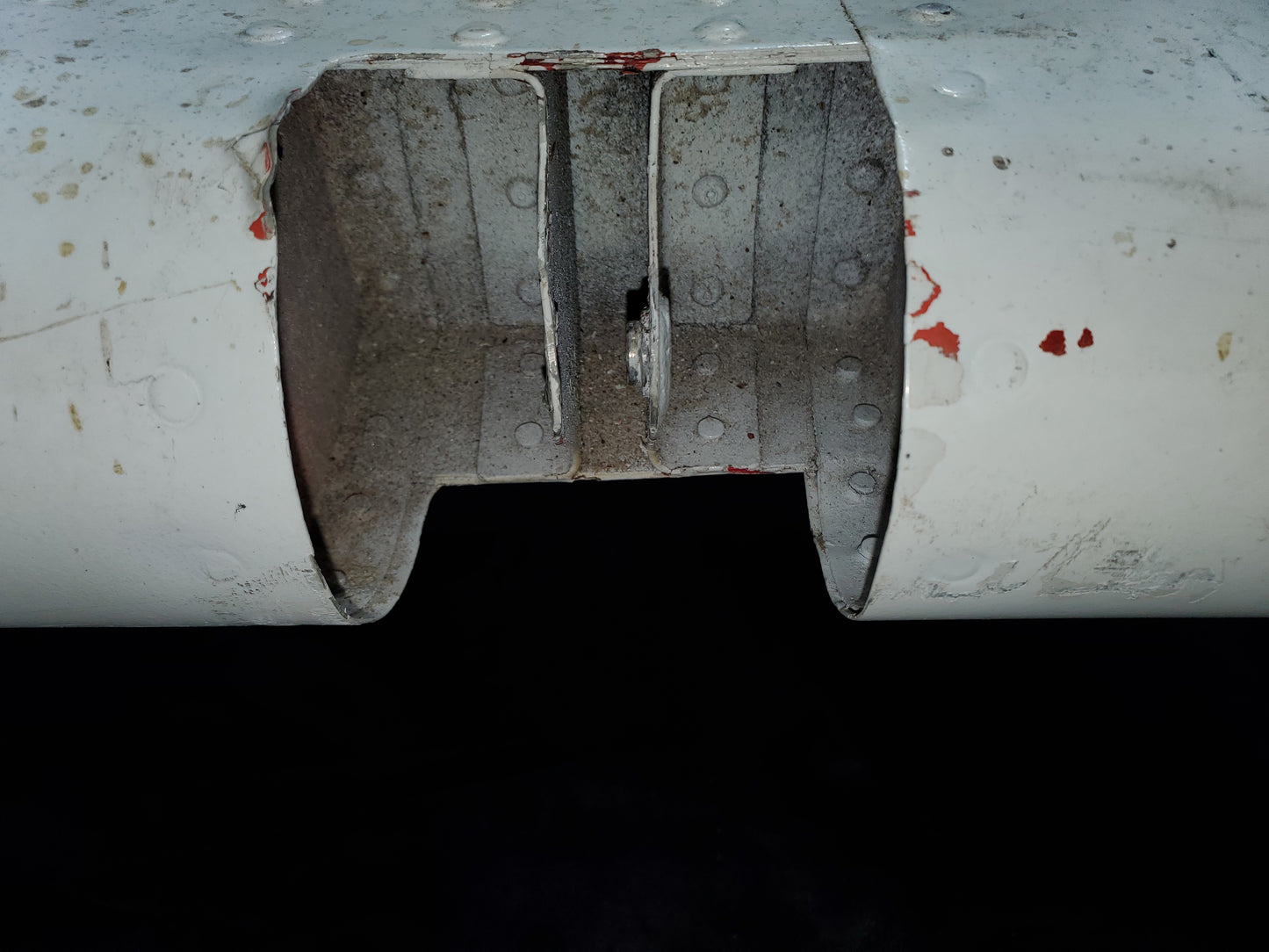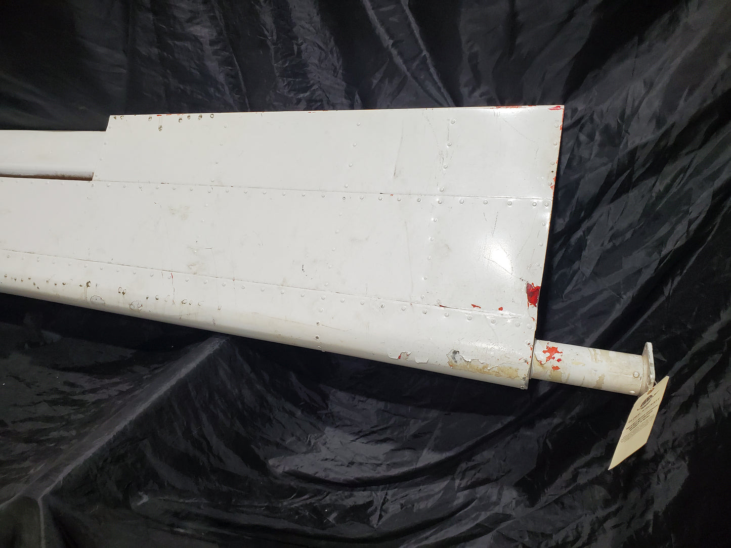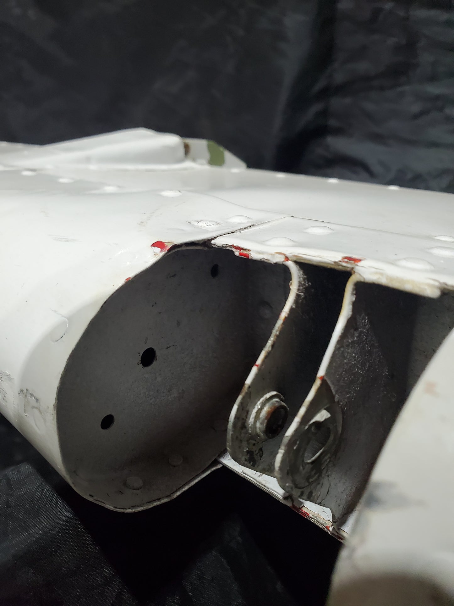 - Bulge in skin at spar. See photos. Holes drilled in skin and Trim tab. Missing hinge bearing.