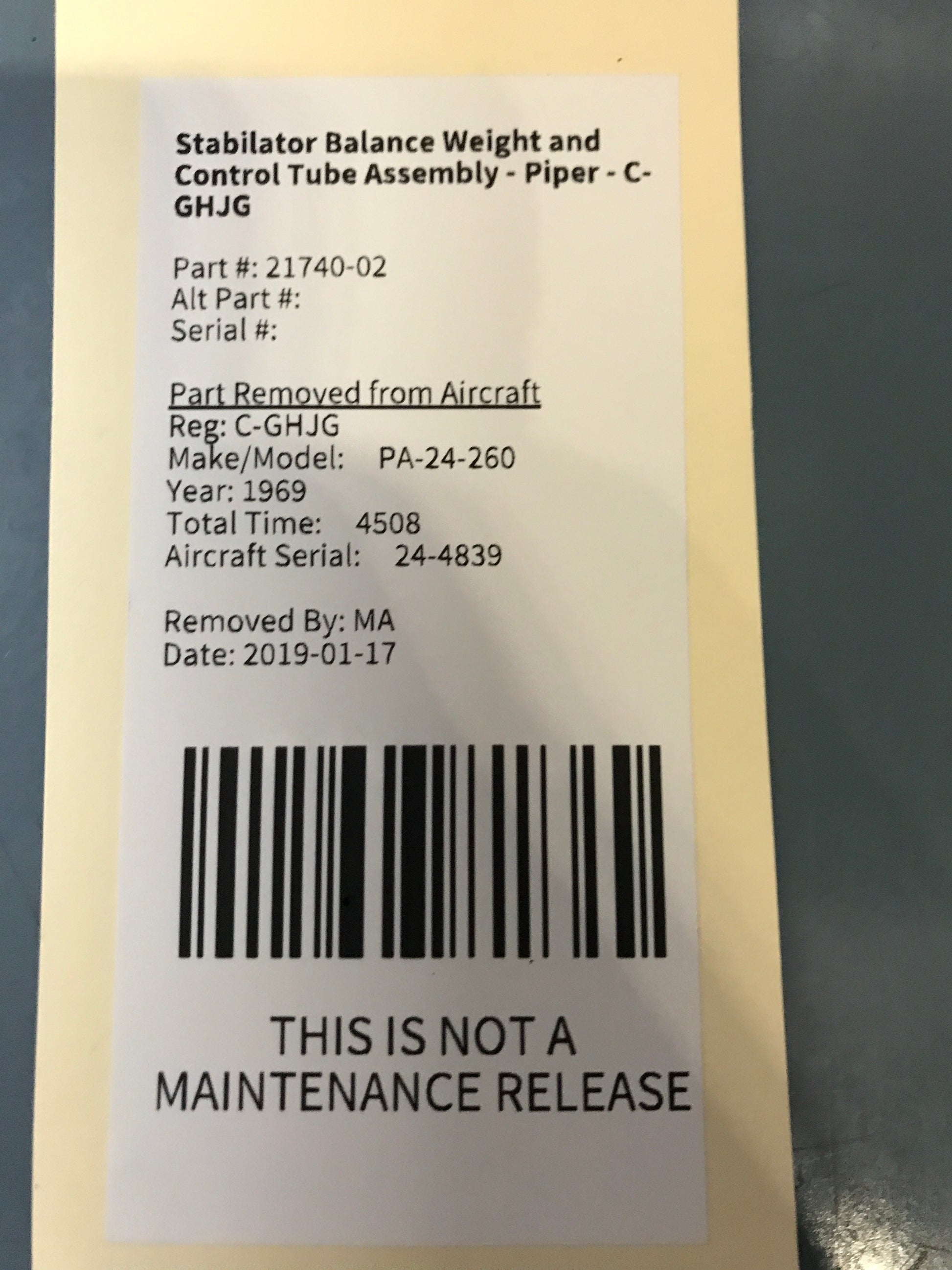 Stabilator Balance Weight and Control Tube Assembly - Piper - C-GHJG