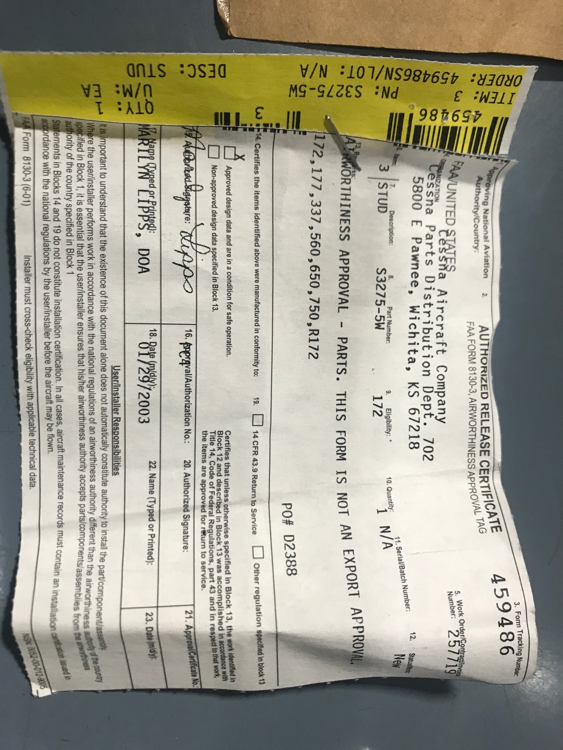 - Aircraft Serial Number: Unknown